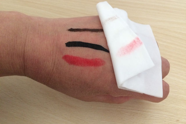 手の甲にパウダーファンデーションを塗り、アイブロウペンシル、口紅、アイシャドウ、リップがどれくらい落ちるか検証してみました。